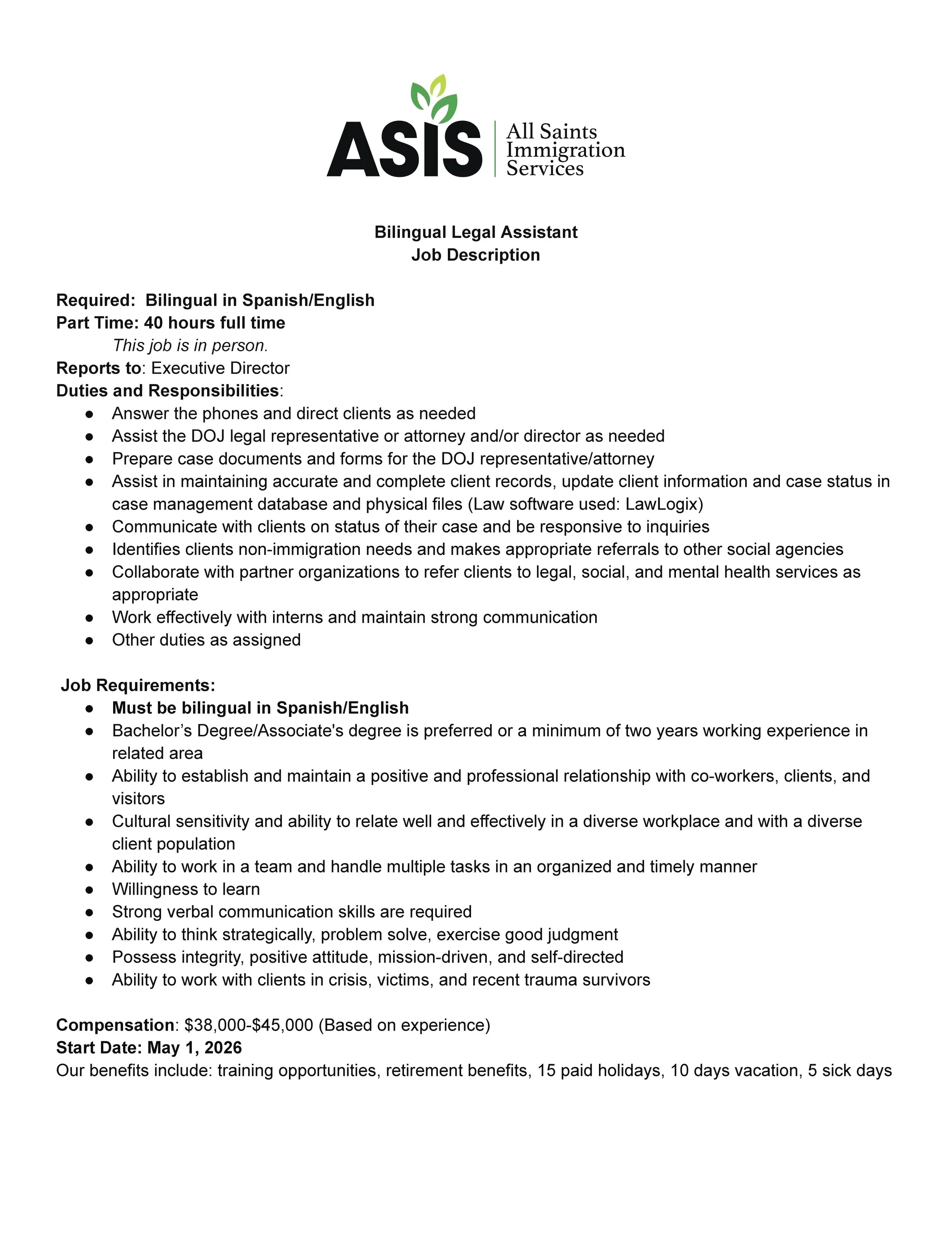 Download Job Description Apply Here Please direct any questions to the Director, Stacy Preston at stacy@allsaintsimmigration.com